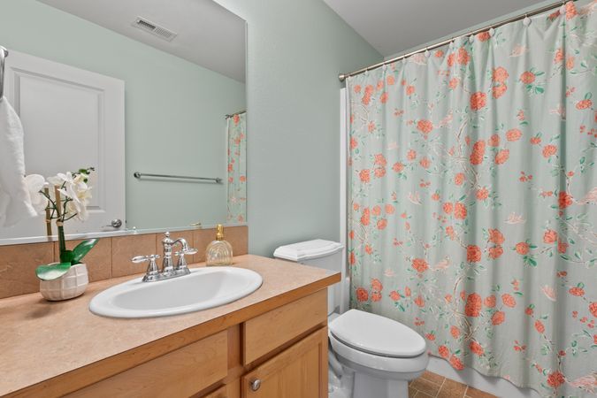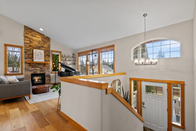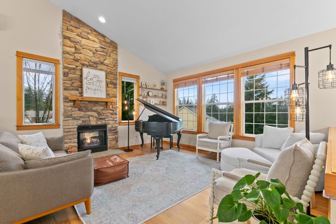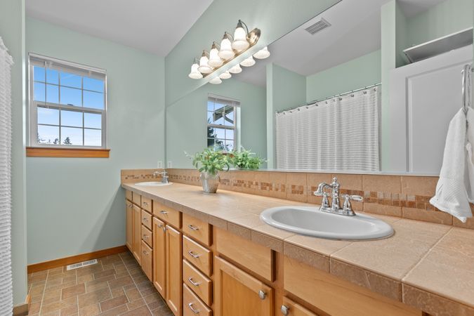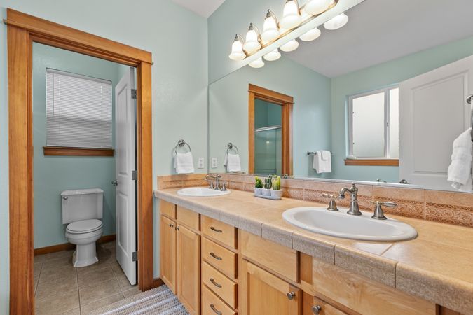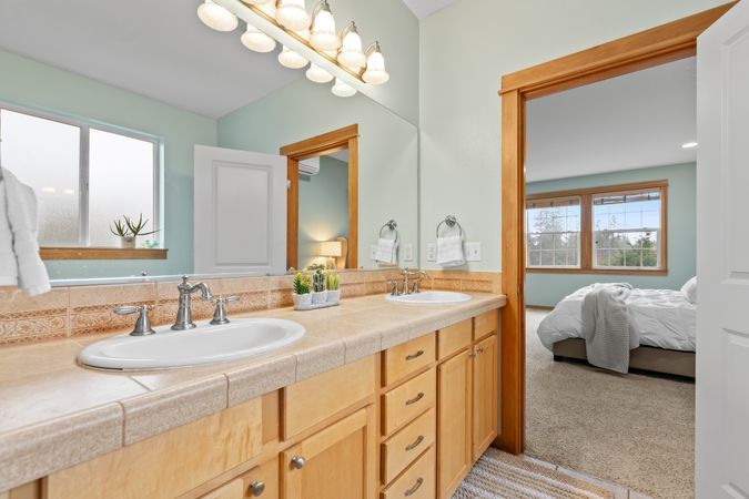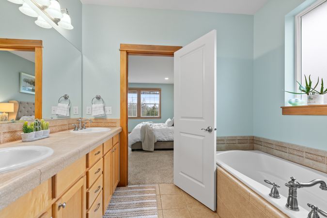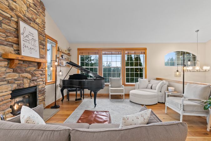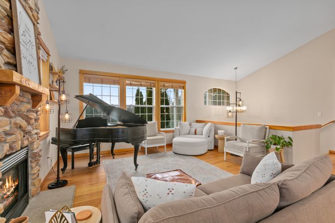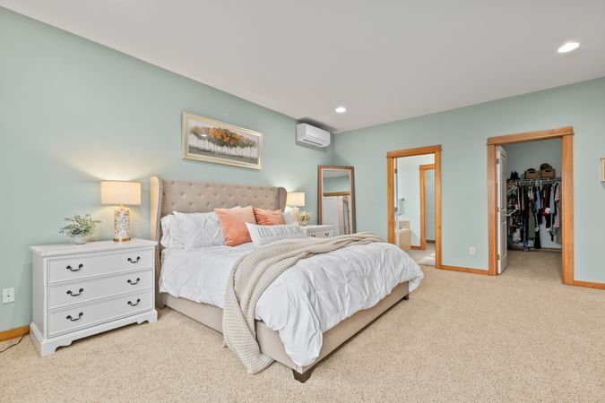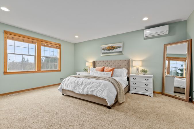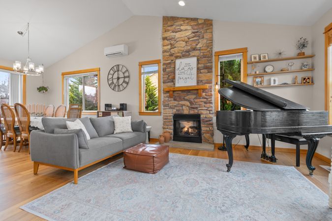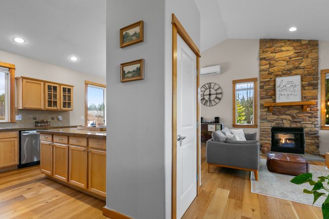 Relax in the bright and airy living room, complete with air conditioning and a striking gas fireplace that serves as the room’s focal point. Upstairs, you’ll discover a cozy bedroom, a sizable guest bathroom with expansive counter space and dual sinks, and a sizeable primary suite featuring a walk-in closet and a five-piece en-suite bath.