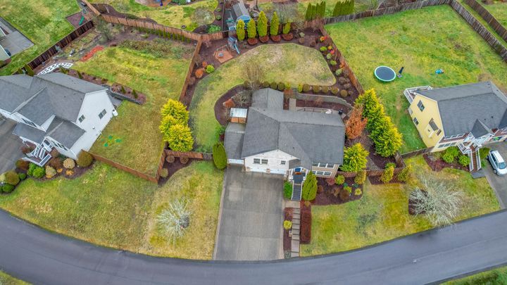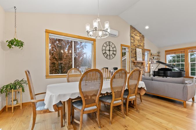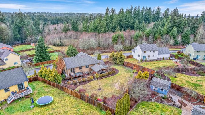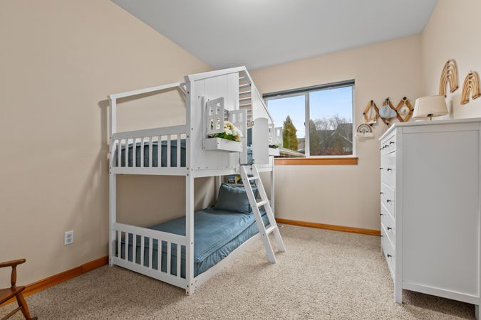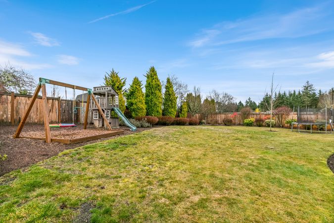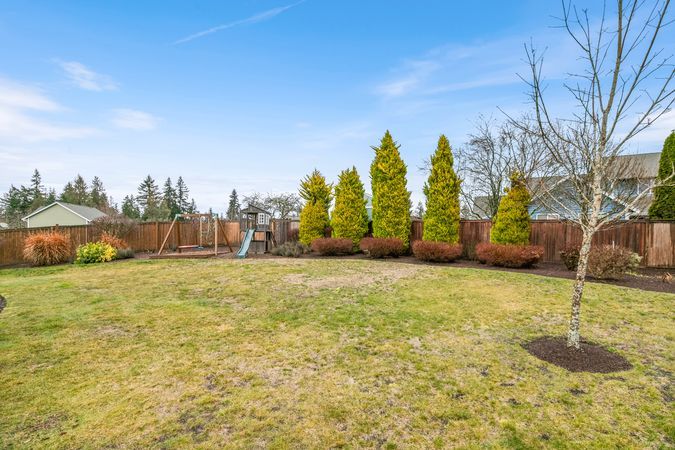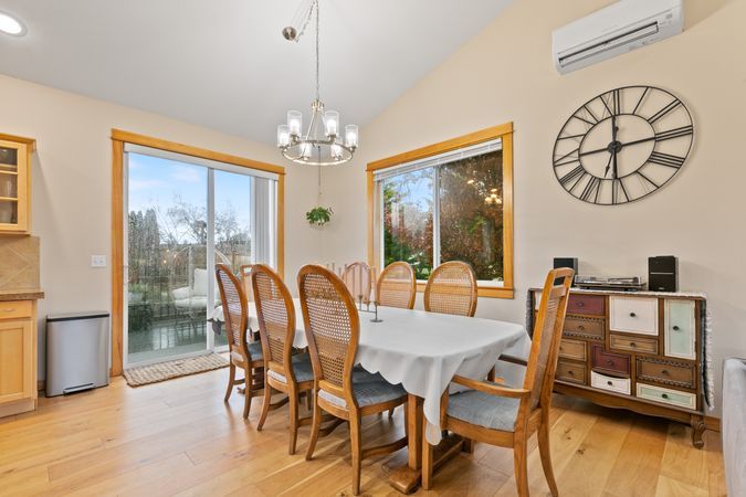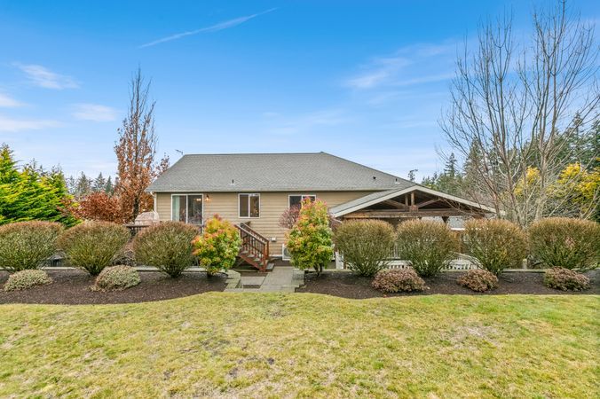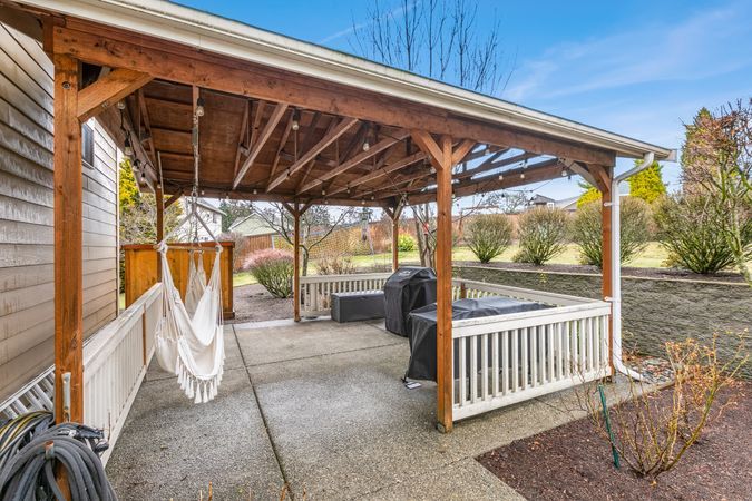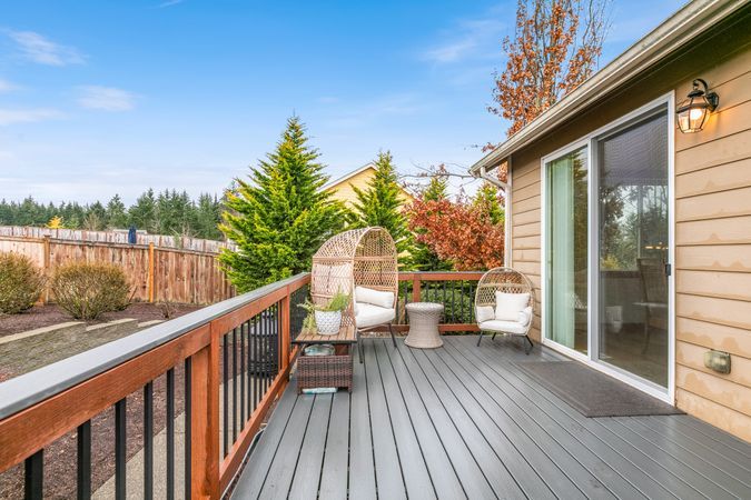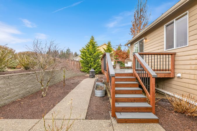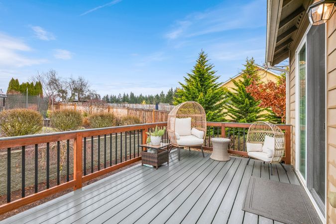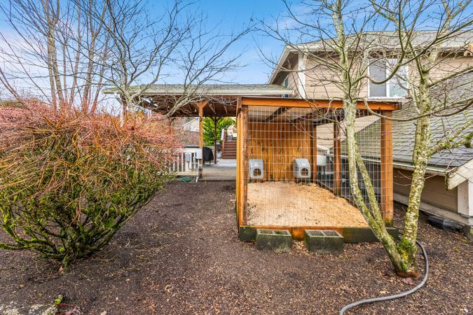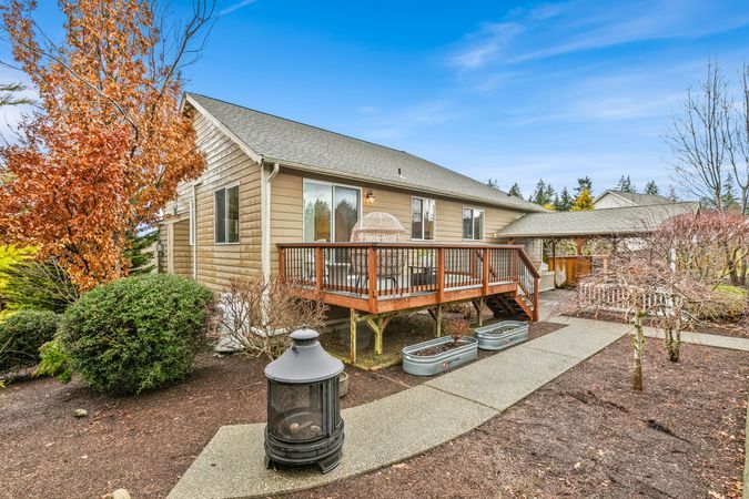 Step outside to enjoy the new Trex deck, where you can unwind while overlooking the meticulously manicured lawn, which is equipped with an automatic sprinkler system. The covered patio offers an inviting space for entertaining guests year-round.