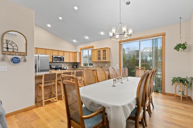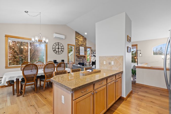 Welcome to this lovingly maintained, light-filled residence, offering thoughtful updates throughout. Upon entering, you are greeted by a beautifully designed herringbone-tiled foyer leading to expansive new wide-plank oak floors. The spacious kitchen boasts a large island, perfect for both meal prep and casual dining, and flows effortlessly into the dining area, creating an ideal space for entertaining.